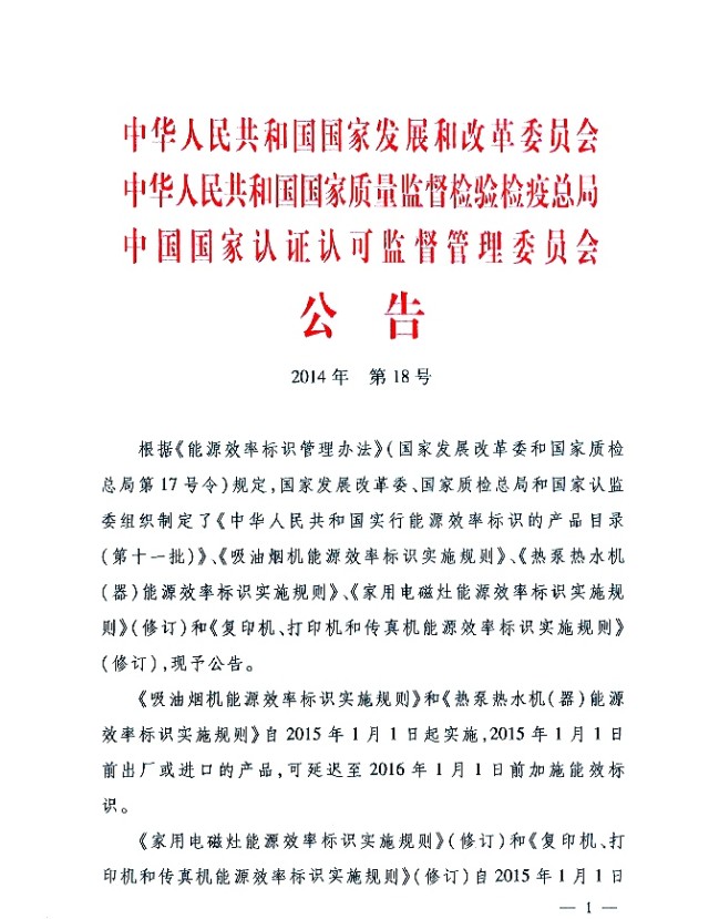 國家發(fā)改委近日發(fā)布公告稱,國家發(fā)展和改革委員會、國家質(zhì)檢總局和國家認(rèn)監(jiān)委近日聯(lián)合制定了《熱泵熱水機(jī)(器)能源效率標(biāo)識實施規(guī)則》(修訂),新規(guī)則將于2015年1月1日開始實施,報告指出,2015年1月1日以前出廠或者進(jìn)口的產(chǎn)品,可延遲到2016年1月1日前加施能效標(biāo)識。據(jù)小編了解,為了進(jìn)一步加強(qiáng)能效標(biāo)識的信息化水平,提高能效標(biāo)識的可讀性與相符性,將鼓勵企業(yè)在能效標(biāo)識上附加二維碼,能效標(biāo)識二維碼將采用國際通用過的QR碼,由生產(chǎn)企業(yè)在中國能效標(biāo)識網(wǎng)上申請,填寫產(chǎn)品的信息之后,能效標(biāo)識信息系統(tǒng)形成與產(chǎn)品型號唯一相對應(yīng)的二維碼,消費者也可以通過掃描二維碼進(jìn)行查詢。