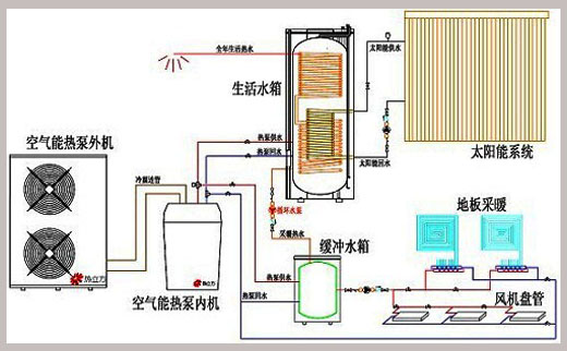 系統(tǒng)采用空氣能熱泵輔助太陽能,或電輔助太陽能,或單獨空氣能熱泵帶動,結(jié)合地暖、風機盤管(立式或者吊頂)實現(xiàn)冬季采暖;