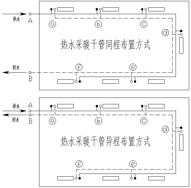 2、而在下圖的異程系統(tǒng)中,供水與回水主管中熱媒的流動(dòng)方面則是一致的。供水由A點(diǎn)起經(jīng)a立管至B點(diǎn)的距離遠(yuǎn)大于由A點(diǎn)經(jīng)f點(diǎn)立管至B點(diǎn)的距離,將產(chǎn)生各環(huán)路阻力不平衡的現(xiàn)象,設(shè)計(jì)人員通常會(huì)采用選擇管徑和設(shè)調(diào)節(jié)閥門等措施來降低這種不平衡的弊端,如果不采用這些措施,必然會(huì)造成從a立管向f立管散熱量逐次降低的問題。盡管從理論上看,異程系統(tǒng)不如同程系統(tǒng)來得合理,但由于異程系統(tǒng)回水主管簡(jiǎn)短,在一定程度上節(jié)約了初投資,而且在施工時(shí)可以采用共架敷設(shè)(因供回水主管坡向一致),易于施工,所以實(shí)際采用較多。