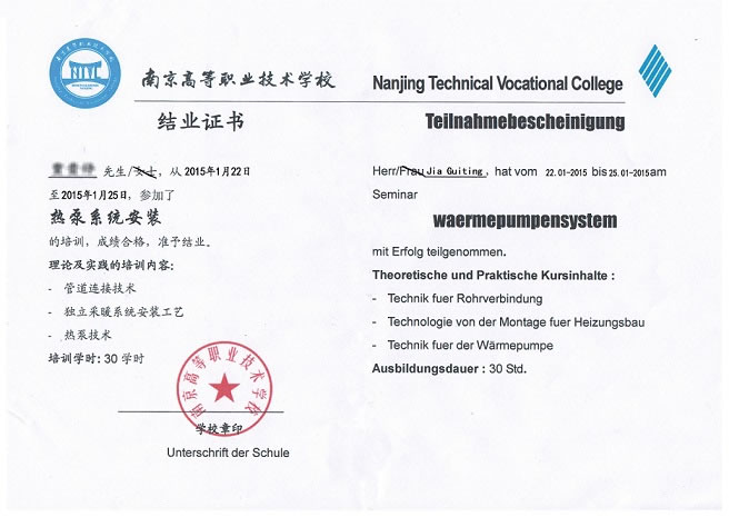 經(jīng)過30學(xué)時(shí)的培訓(xùn),我公司同事獲得南京高等職業(yè)技術(shù)學(xué)校所頒發(fā)的結(jié)業(yè)證書,培訓(xùn)內(nèi)容包括空氣能(空氣源)熱泵管道連接技術(shù)、獨(dú)立采暖系統(tǒng)安裝工藝、熱泵技術(shù)等內(nèi)容,理論與實(shí)訓(xùn)安裝相結(jié)合,便于更加全面掌握空氣能(空氣源)熱泵知識(shí)。